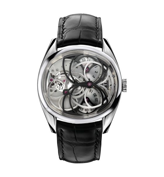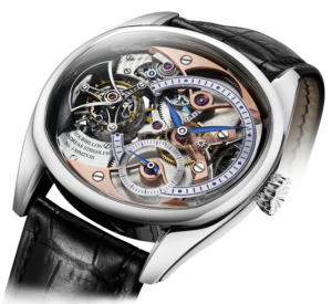 The energy is accumulated in the course of every second by a star shaped satellite through the tensioning of a hairspring. The mechanism is then released, the balance receives the energy stored in the hairspring and the satellite wheel again rests against the stopping jewel.The system has the advantage that the complete escapement, including the escapement wheel, moves freely between two impulses, uninfluenced by the movement. Allowing the use of the Swiss anchor escapement unimpeded. The advantage is escapement type perfected and proven over a period of more than 200 years. Watches may be ordered in 18kRG or Platinum ( $111,000 or $111,000)