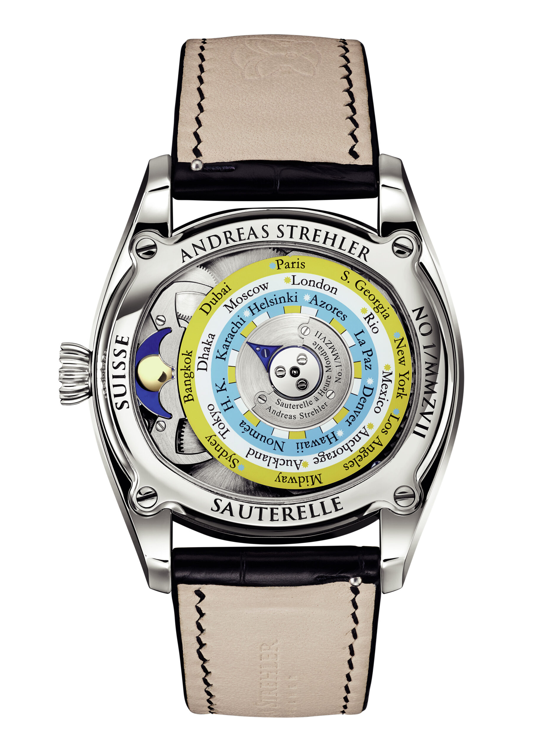 The Sauterelle a Heure Mondiale being a Sauterelle, has the patented Andreas Strehler remontoir d’égalité at 10 o’clock. At 8 o’clock on the dial, there is a three-dimensional view of the northern hemisphere as seen from above the north pole, rotating counter clockwise once in 24 hours, as the earth does. This is where the phase of the moon indication used to be (not to worry, it still exists and it is still as precise as ever, but we come to that later). This earth on the dial rotates under Andreas Strehler’s familiar sapphire crystal minute ring which here indicates night on earth.On the movement side of the watch, there is a ring with 24 names of individual cities, representing the 24 time zones. In the centre of this ring, there is a blue steel arrow.