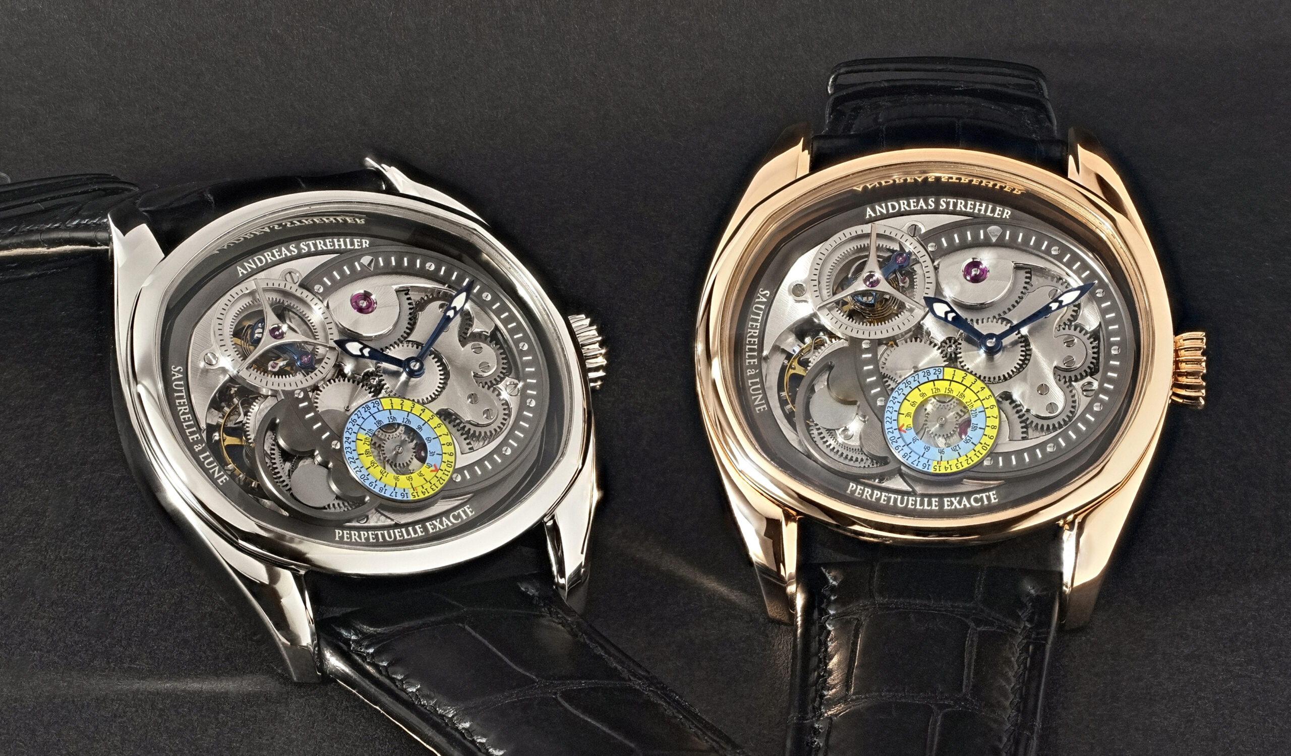 The Lune Exacte features a new patent pending high precision moon age indication, and Andreas Strehler’s patented remontoir d’égalité. It also happens to be the most precise phase of the moon indication ever built in a wristwatch. The Lune Exacte is the logical next step of the Sauterelle à lune perpétuelle which features a phase of the moon indication with a precision of one day in two million years. In 2014, this feat of engineering earned the Sauterelle à lune perpétuelle an entry in the Guinness Book of World Records.