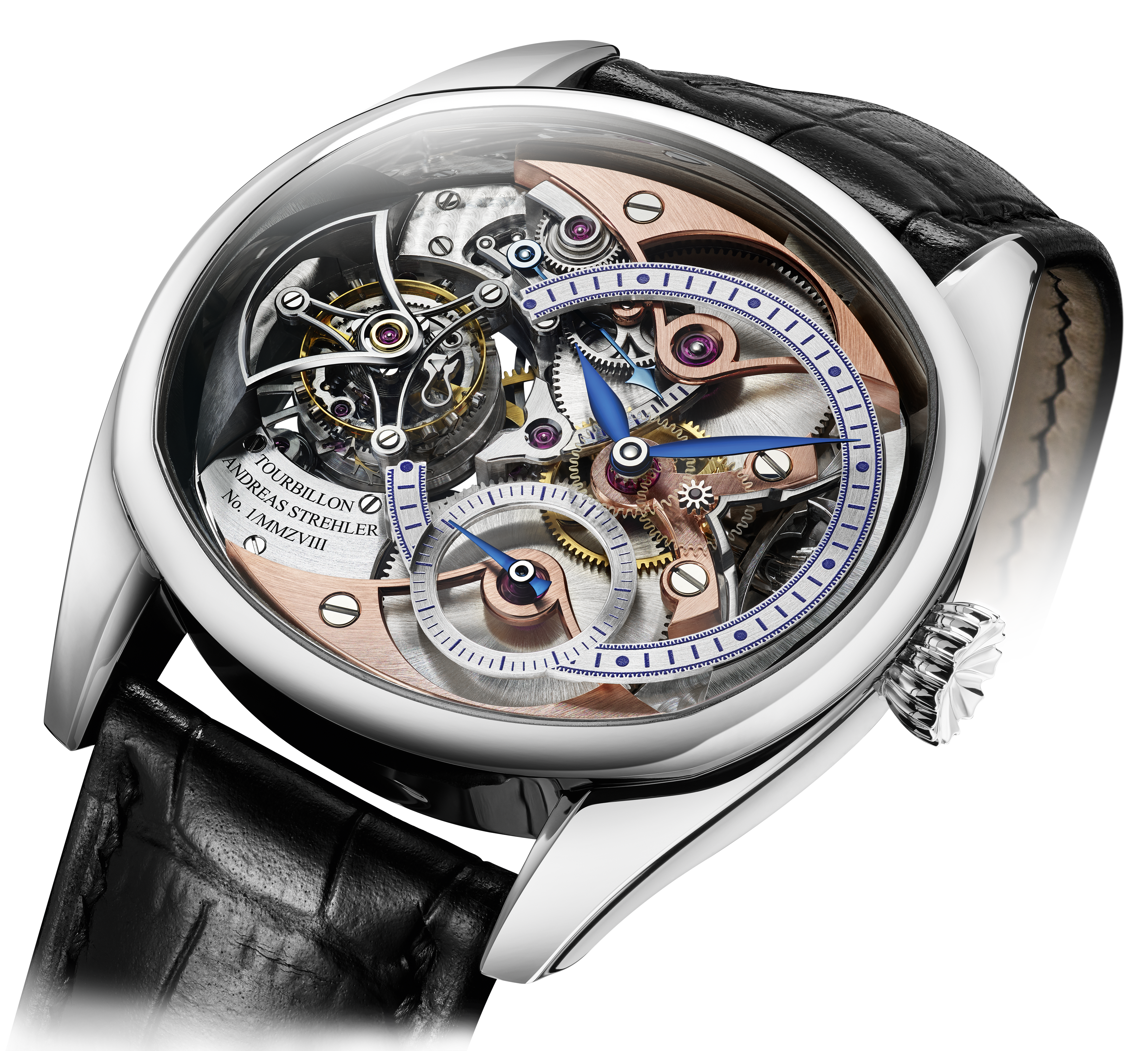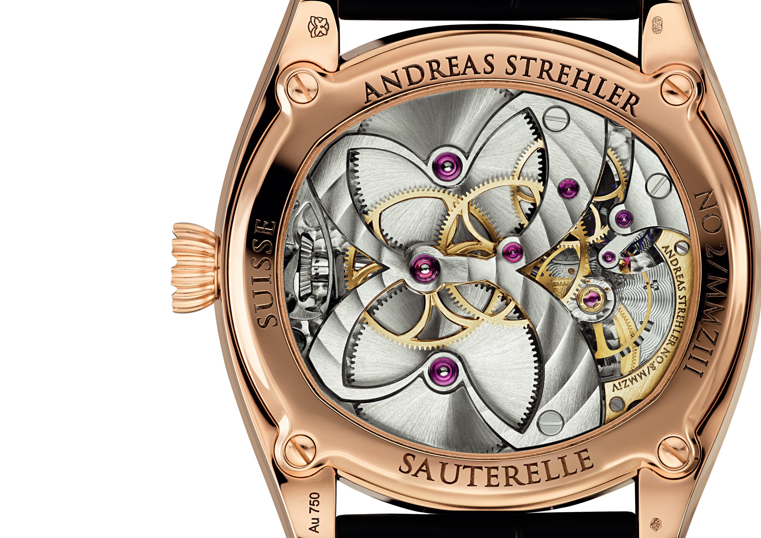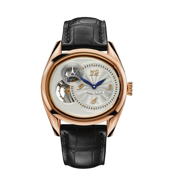 is filtered through a Remontoir d’égalité and transferred to a Tourbillon escapement mounted on the same axis to eliminate the influence of gravity on the escapement. ===Voilà the Trans-axial® Remontoir Tourbillon. The Trans-axial® Remontoir Tourbillon escapement is hand wound, using Andreas Strehler’s own true conical gear wheels (which are the envy of the watch industry).To show the power left in the two mainspring barrels, the movement has a power reserve indication using an extremely small differential gear, another speciality of Andreas Strehler.