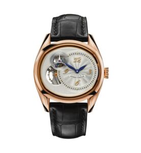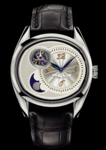 The next watch, Cocon, an elegant and traditional format runs into Papillon. The Papillon (butterfly) withdraws into the background, in its cocoon, hidden under the dial.The gear train, previously so dominant, is now hidden beneath the dial, invisible to the wearer. The delicate butterfly-shaped cage, formerly the visible hallmark of the movement, is now at the back of the watch, well protected, but still visible under glass. he watch does have a certain transparency. Andreas opted against the classical layout of the dial displaying hours and minutes with a separate small seconds dial. The breathing spirals of the hairspring are visible through the dial, just below small seconds. This enables the wearer to look into the dial rather than at it. Starting with the small seconds counter in its dominant position at 10 o’clock, which has never been before realized in any movement. The wearer can follow the different increasing increments of time as they are displayed on different levels of the dial. (18kRG $88,000 , Platinum $101,000)