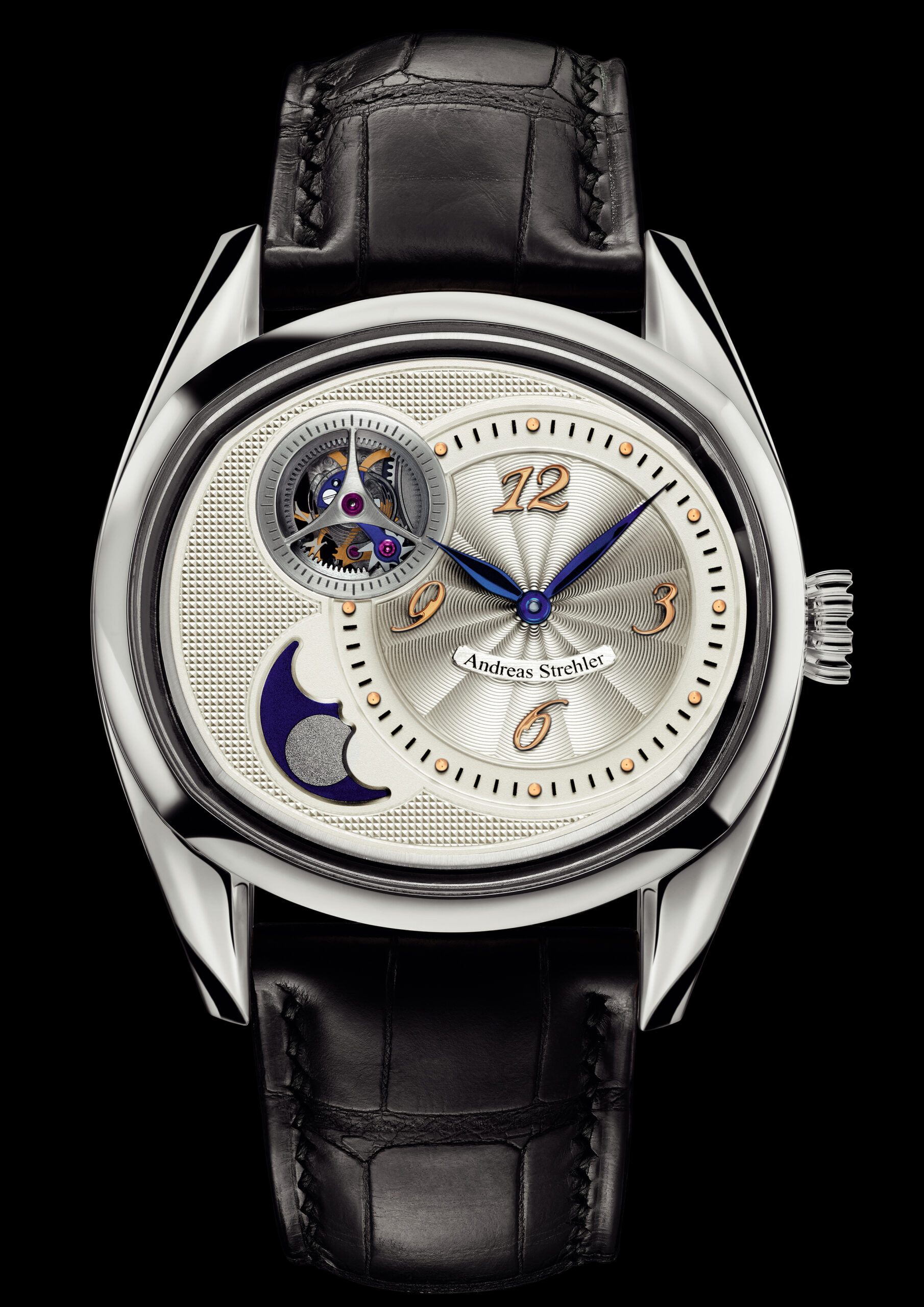 GMT is now your reference time and you are ready for take-off.During a relaxed flight, the Captain – or ideally: your own pilot – tells you the time at your destination (or your local time). With the crown pulled to the first position, the hour hand can be set in one-hour-steps independently from the minute hand and without stopping the movement. Simultaneously, the hand in the middle of the destination-disk at the back of the movement is moved to the correct time zone, also indicating the relevant GMT offset. GMT and day/night at Greenwich always remains visible at a glance on the dial.And now, as promised above, we come to the moon which Andreas Strehler after all has not entirely left: On the movement side of the watch, next to the crown, there it is: The world record phase of the moon. (18kRG $129,600/Platinum $129,600)