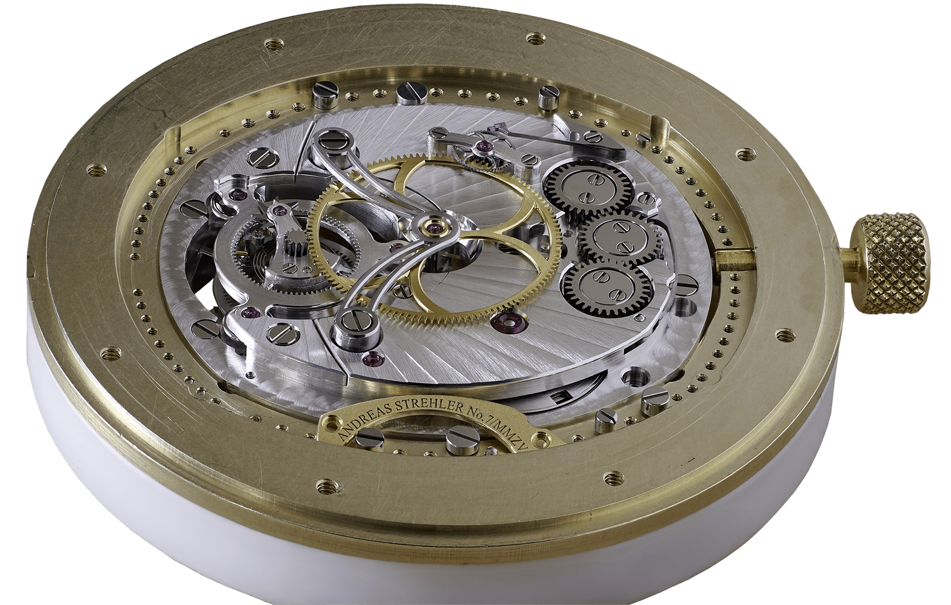 A pocket-watch displaying the time is inserted into the desk calendar unit which is, in fact, a perpetual calendar. Once the owner goes away from his desk, he takes the pocket watch with him. The desk calendar stops. Once the owner returns to his desk after some days or weeks, he inserts the pocket watch into the desk calendar. The desk calendar knows how long the owner was absent and sets the date right. It has a mechanical memory. In 2002, Andreas Strehler designed a special project for Chronoswiss, the “Chronoscope”, a monopusher automatic chronograph, built from vintage Enicar movements. The watch won “Watch of the Year 2003” . In 2003, the group whom restarted Moser et. Cie decided they wanted unique calibres to launch the rejuvinated Schaffhausen marque. In 2005, Andreas Strehler founds UhrTeil to manufacture parts , develop prototypes and calibres for other manufactures.