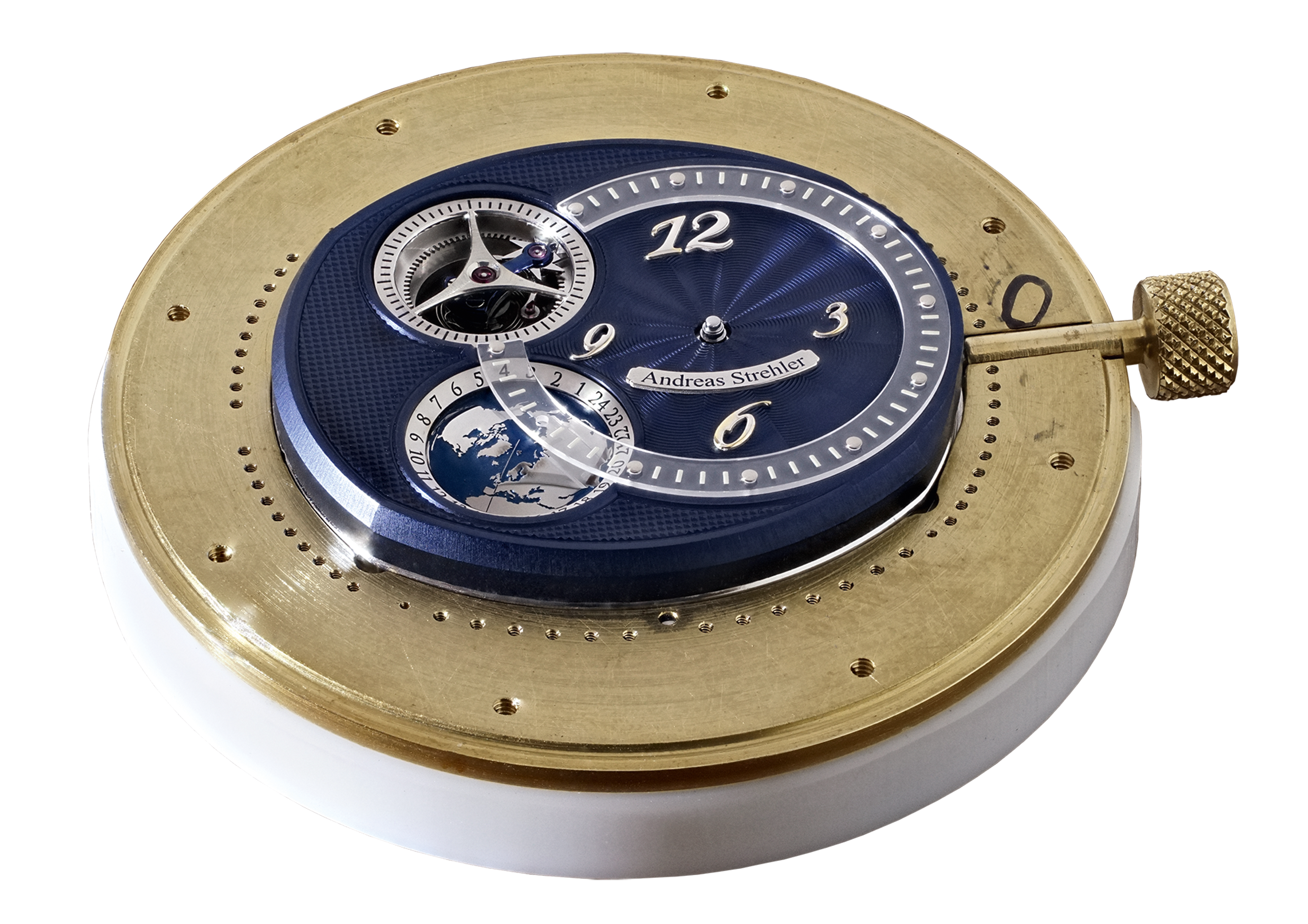In preparation for your next journey, you take your Andreas Strehler Sauterelle à heure mondiale out of its box and wind it gently. You will notice that winding an Andreas Strehler watch is a very pleasing experience. This is due to his use of true conical gear wheels in the winding mechanism. The movement starts to work and you notice the remontoir d’égalité coming into action, charging the escapement every second with the exact same amount of energy and indicating the seconds. You continue to wind the watch until the twin mainspring barrels, linked by a differential gear, are fully wound. Due to the special Andreas Strehler stop works, limiting the mainsprings to their sector of linear energy discharge, this moment is distinctly felt.