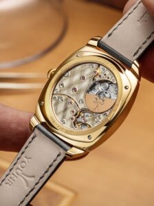The sapphire case back reveals the extra-flat, self-winding Vaucher Manufacture movement, reference 5400, whose bridges have been designed by Roland Gloor to free up as much of the guilloché surface as possible and express YOUHR’s distinctive design. The bridges were hand-bevelled in the YOUHR workshop. The screw hole contours and edges have been outlined with a stop line, a YOUHR signature of sophistication. The 22-carat gold oscillating weight is also hand-bevelled.